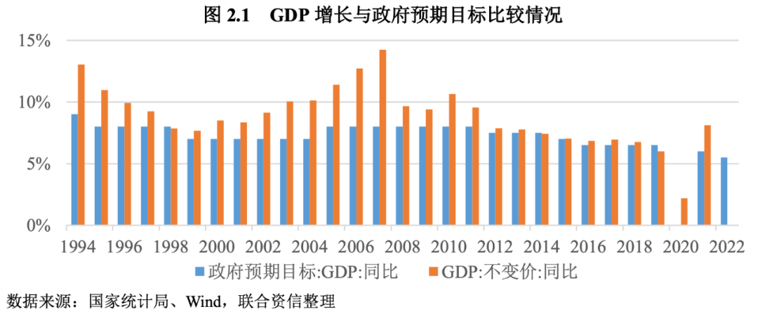 從歷史看,有記錄以來絕大多數(shù)年份實(shí)際經(jīng)濟(jì)增長均達(dá)到或超過增長預(yù)期目標(biāo)。政府從1994年開始設(shè)定年度經(jīng)濟(jì)增長預(yù)期目標(biāo)以來,總體上每年的實(shí)際增長高于預(yù)期增長目標(biāo),只有1998年、2014年和2019年三年的實(shí)際增長沒有超過預(yù)期目標(biāo)。1998預(yù)期目標(biāo)是增長8%,實(shí)際增長7.85%,低了0.15個(gè)百分點(diǎn),主要是受到亞洲金融危機(jī)的沖擊和國企脫困及洪澇災(zāi)害的影響。2014年政府的預(yù)期目標(biāo)是7.5%左右,實(shí)際比預(yù)期低了0.17個(gè)百分點(diǎn),基本實(shí)現(xiàn)目標(biāo),主要是當(dāng)年經(jīng)濟(jì)進(jìn)入“三期疊加”的“新常態(tài)”階段,政府更重視提質(zhì)減速,導(dǎo)致下行壓力較大。當(dāng)年有多個(gè)省份沒有達(dá)到預(yù)期目標(biāo),其中煤炭資源大省山西實(shí)際增長與預(yù)期增長的偏差最大,達(dá)到4.1%。2019年政府預(yù)期目標(biāo)是6%-6.5%的增長區(qū)間,實(shí)際增長6%,達(dá)到了目標(biāo)區(qū)間下限,也可視為達(dá)到了目標(biāo)。2019年世界經(jīng)濟(jì)貿(mào)易增長放緩,動(dòng)蕩源和風(fēng)險(xiǎn)點(diǎn)增多,國內(nèi)結(jié)構(gòu)性體制性周期性問題交織,尤其是中美貿(mào)易沖突加劇,經(jīng)濟(jì)下行壓力較大。總體上看,1994年以來的近30年,我國經(jīng)濟(jì)每年都基本實(shí)現(xiàn)了預(yù)期目標(biāo)。
