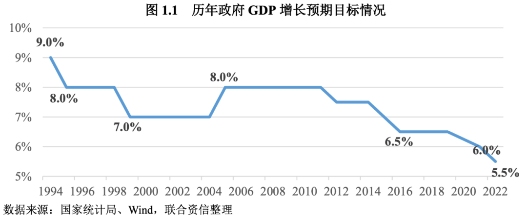 政府報(bào)告提出2022年GDP增長5.5%左右的增長目標(biāo),是近30年來最低的預(yù)期目標(biāo)。歷史上看,自1994年在年初設(shè)定全年經(jīng)濟(jì)增長預(yù)期目標(biāo)以來的近30年里,政府經(jīng)濟(jì)增長目標(biāo)從最初的9%波動(dòng)下調(diào)到了今年的5.5%,下調(diào)了3.5個(gè)百分點(diǎn)。其中1995年從上年的9%下調(diào)至8%,主要是在經(jīng)濟(jì)過熱,通脹形勢較為嚴(yán)重的情況下,國家主動(dòng)調(diào)控降溫經(jīng)濟(jì)。1999年增速下調(diào)1個(gè)點(diǎn)至7%,則主要是受到亞洲金融危機(jī)的影響。唯一一次上調(diào)目標(biāo)發(fā)生在2005年:在入世后平穩(wěn)高速增長的基礎(chǔ)上,為了抓住發(fā)展機(jī)遇期,實(shí)現(xiàn)更快平穩(wěn)增長,將增長預(yù)期目標(biāo)由原來的7%上調(diào)為8%。從2012年到2016年,進(jìn)入持續(xù)的單邊下調(diào)階段,增速目標(biāo)下調(diào)了1.5個(gè)百分點(diǎn)至6.5%。也正是在這個(gè)時(shí)期,我國進(jìn)入“三期疊加”的新發(fā)展階段,積極推進(jìn)結(jié)構(gòu)調(diào)整和增長動(dòng)力轉(zhuǎn)換,注重生態(tài)環(huán)境保護(hù)和高質(zhì)量發(fā)展。2019年,在供給側(cè)結(jié)構(gòu)性改革深入推進(jìn)和中美貿(mào)易摩擦等因素影響下,經(jīng)濟(jì)下行壓力進(jìn)一步增大,當(dāng)年將增速目標(biāo)設(shè)定為6%-6.5%。縱觀近30年來增速目標(biāo)的下調(diào),有些是積極主動(dòng)的宏觀調(diào)控,但更多是在內(nèi)外部環(huán)境壓力下所做的適應(yīng)性調(diào)整。