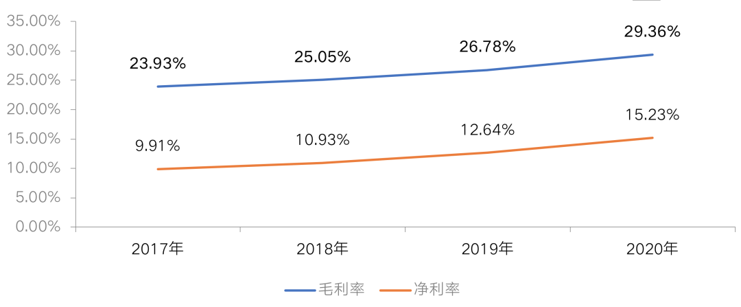近年來,隨著整個(gè)房地產(chǎn)行業(yè)規(guī)模見頂,相比傳統(tǒng)地產(chǎn)開發(fā),物管行業(yè)現(xiàn)金流穩(wěn)健,經(jīng)營風(fēng)險(xiǎn)相對(duì)較低,同時(shí)盈利能力也較為穩(wěn)定。從目前上市的物管企業(yè)2017-2020年的加權(quán)平均毛利率和凈利率來看,近年來物管行業(yè)的毛利率和凈利率都保持著穩(wěn)步上升的態(tài)勢(shì)。與此同時(shí),據(jù)CRIC監(jiān)測(cè),2020年典型上市房企的毛利率下降4.8個(gè)百分點(diǎn)至24.3%,凈利率也已下降至10%。