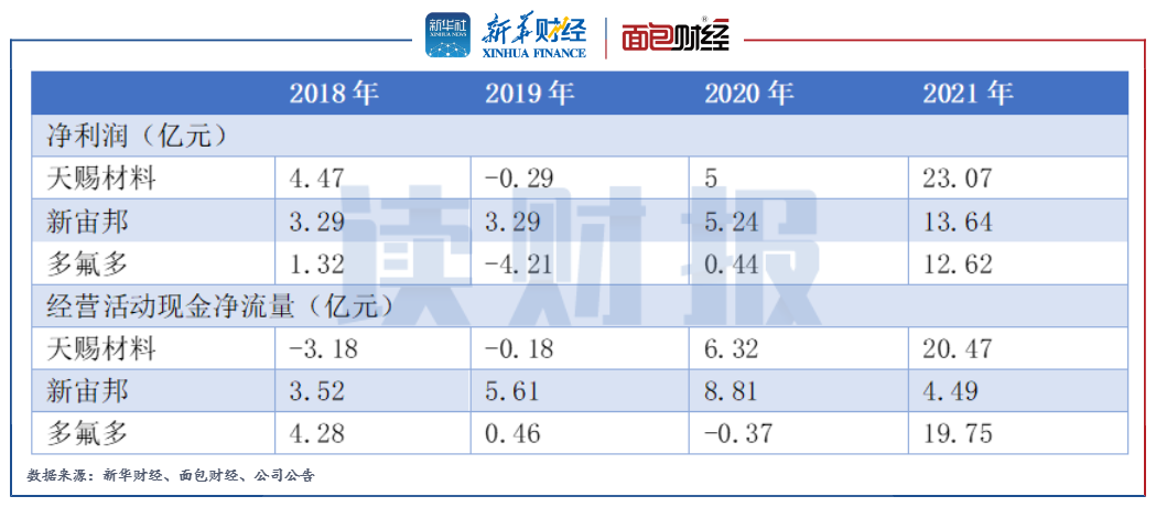 圖3:天賜材料、新宙邦、多氟多凈利潤和經營活動現金凈流量