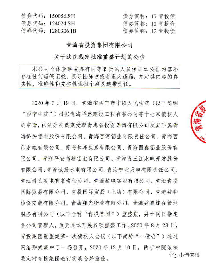 12月27日,青海省投資集團(tuán)有限公司(以下簡稱:“青海省投”)公告稱,法院已裁定批準(zhǔn)《青海省投資集團(tuán)有限公司等十七家企業(yè)重整計(jì)劃》,公司進(jìn)入重整計(jì)劃執(zhí)行期間。