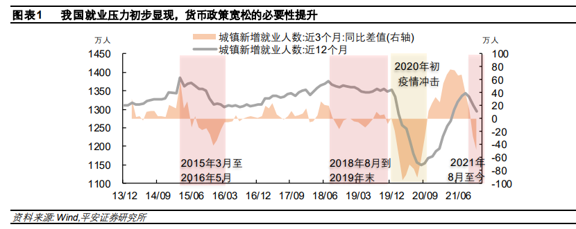 第二,就業壓力,可能會提升,貨幣寬松和房地產、基建的重要性凸顯。平安證券的研報說,從滾動12個月的城鎮新增就業人數可以看到,2021年9月以來,我國新增就業人數已經出現顯著下滑;到2021年11月,新增就業人數已經遠低于疫情前的中樞水平。