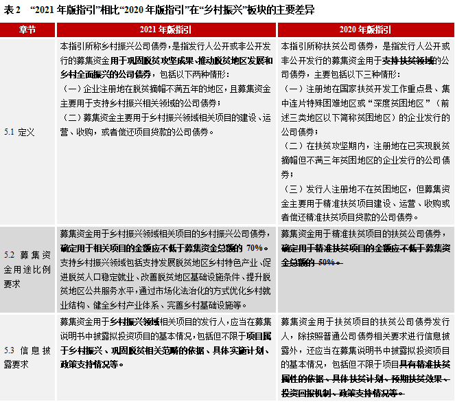 2021年版指引主要修訂以下內容:一是給出鄉村振興公司債券的發行要求,即企業注冊地在脫貧摘帽不滿五年的地區,且募集資金主要用于支持鄉村振興相關領域的公司債券,或主要用于鄉村振興領域相關項目的建設、運營、收購,或者償還項目貸款的公司債券;二是提升資金使用比例,確定用于相關項目的金額應不低于募集資金總額的 70%,較扶貧債券使用比例提升20%;三是明確資金使用范圍,鄉村振興債應支持發展脫貧地區鄉村特色產業、促進脫貧人口穩定就業、改善脫貧地區基礎設施條件、提升脫貧地區公共服務水平,通過市場化法治化的方式優化鄉村就業結構、健全鄉村產業體系、完善鄉村基礎設施等。