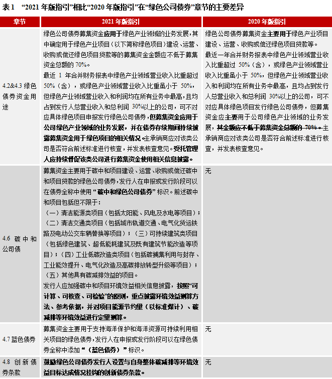 與2020年版指引相比,新版指引主要是強化約束綠色債券募集資金用途,新增“碳中和綠色債券”、“藍色債券”、“鄉村振興公司債”等債券品種的發行規則,同時修訂了對應債券品種的監管要求。
