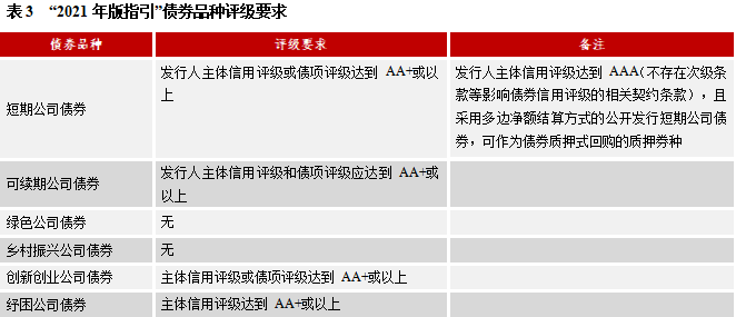 2021年版指引還進一步要求強調了評級要求:發行人發行特定債券品種的,應符合本指引關于主體或債項信用評級的相關要求,適用本所優化融資監管安排的發行人可自主選擇是否進行主體或債券信用評級。當前各項債券評級要求如下,與2020年版指引保持一致。