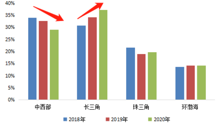 長三角是國內(nèi)發(fā)展較為完備的城市群之一,經(jīng)濟實力強勁、城市發(fā)展相對均衡,三四線城市優(yōu)勢明顯,擁有較強的購買力,同時新經(jīng)濟活躍度高、周邊一二線城市紅利輻射強,從2018年到2020年,50強房企在三四線城市的拿地中,長三角占比持續(xù)提升,從2018年的31%提升至2020年的37%。