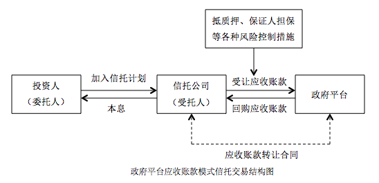 以目前政府平臺融資主要采用的應收賬款轉(zhuǎn)讓加回購的融資模式為例,信托公司發(fā)行信托計劃,募集信托資金,受讓政府融資平臺持有的應收賬款,以該資產(chǎn)未來的現(xiàn)金流作為信托計劃的未來現(xiàn)金流入來源,平臺公司以此融入資金,到期后由其回購應收賬款,實現(xiàn)信托計劃退出。