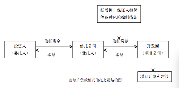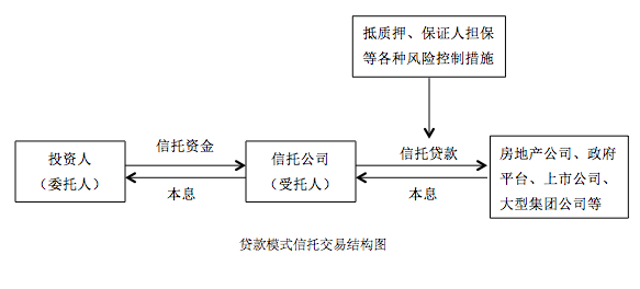 信托公司通過信托計劃向投資人募集資金并向房地產(chǎn)公司、政府平臺、上市公司、大型集團公司等發(fā)放貸款,融資方以其關(guān)聯(lián)資產(chǎn)進行抵質(zhì)押、保證人擔保等各種風險措施保證債權(quán)安全,到期后由融資方還本付息。