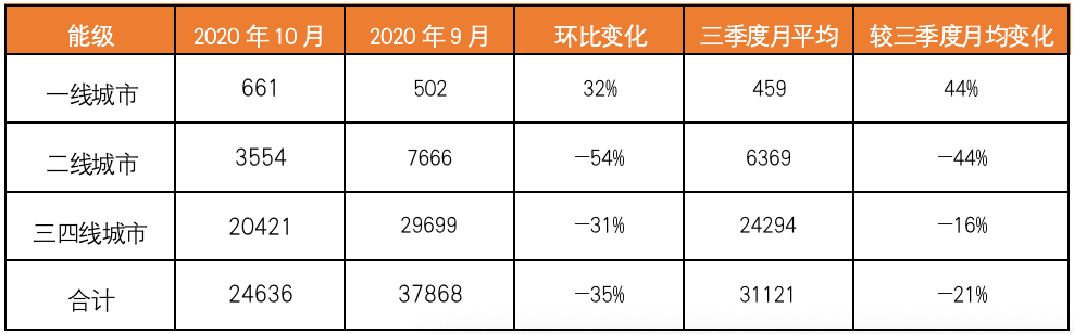 表:2020年10月各能級城市土地供應變化情況(萬平方米)