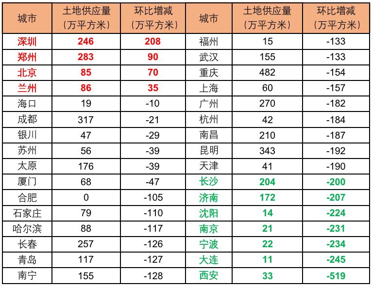 注:考慮到各城市土地成交規模變動較大,實際規模變化更能直觀反映供應量的變動,故在上表中不顯示環比變動。