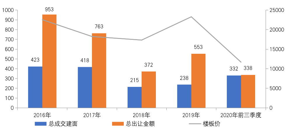 圖:2016-2020年前三季度深圳經營性土地總成交建面、成交金額和樓板價(萬平方米、億元、元/平方米)