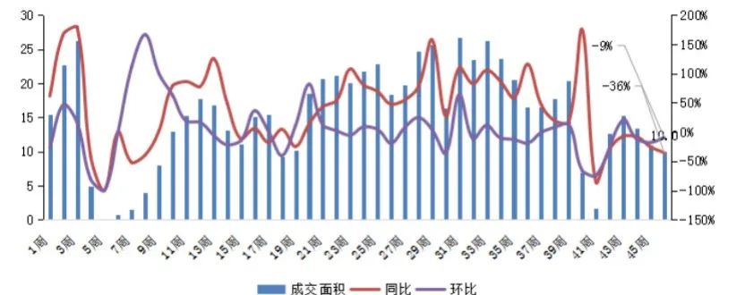 截止11月15日,深圳二手住房周成交面積同、環比齊跌,成交體量回落至10萬平方米,環比跌9%,同比跌36%。新政后二手住房市場需求大幅縮量,預計后續市場規模短期內仍將低位調整。