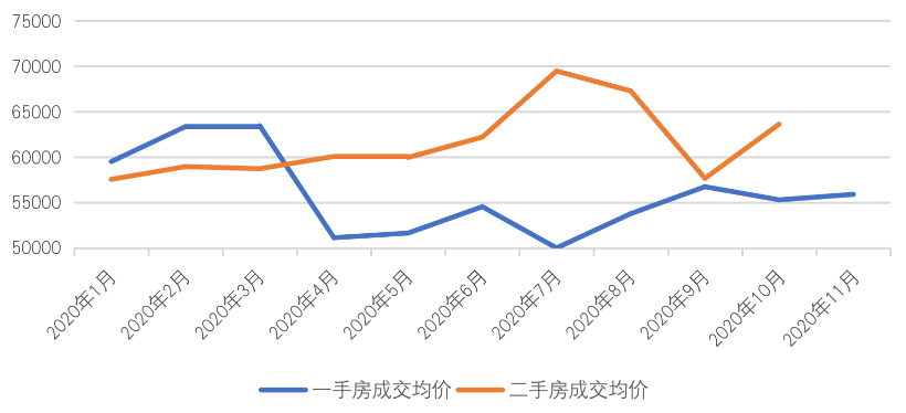 一手房方面,均價受市場及政策更為明顯,2020年6月在疫后恢復階段曾出現過一個小高峰,隨后受政策影響跌入全年最低谷,為50011元/平方米,隨后再緩慢恢復。