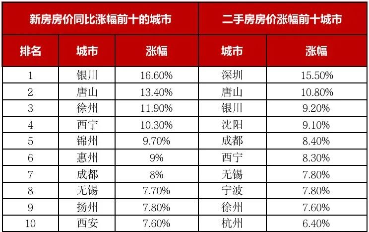 表:一二手房房價同比漲幅前十城市