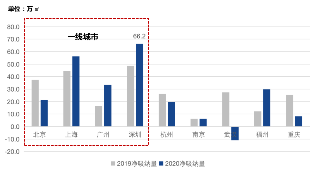 據CAIC重點城市監測顯示,2020全年一線城市中僅北京凈吸納量同比下降,年中兩次疫情反復對北京辦公租賃成交影響較大;上廣深凈吸納量同比均有較大幅度的上升,其中深圳更是以66.2萬㎡領跑全國,科技行業受疫情影響較小,深圳下半年需求反彈明顯、表現強勁,貢獻了全年近5成凈吸納量。