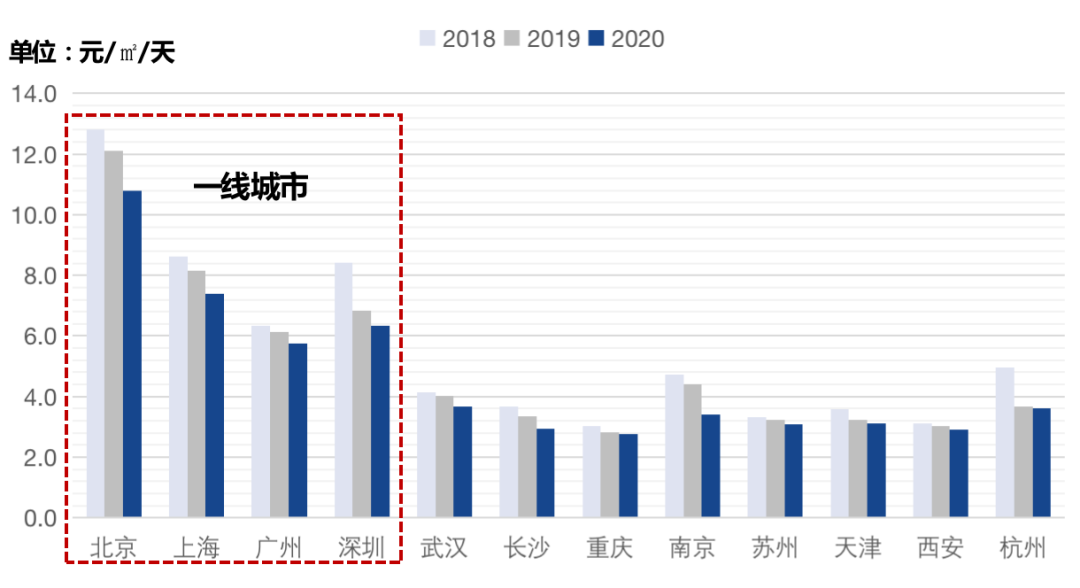 1、租金近三年持續下降,一二線城市坪效差距大