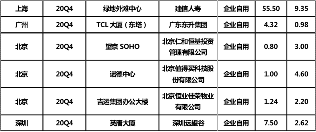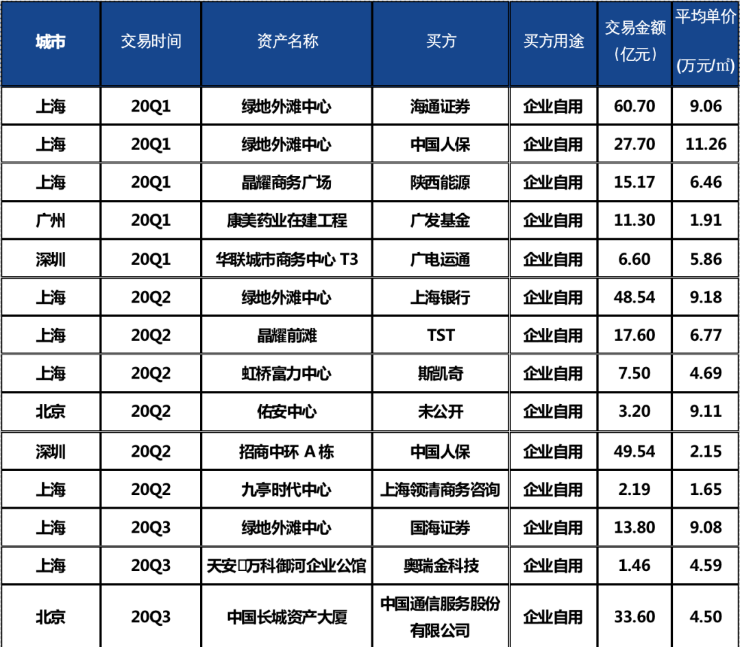因企業自用需求產生的交易較往年成倍增長,迎來高峰: 一方面現金流充足的企業看準市場的窗口期以較合理的價格購入優質資產,可以實現投資長期的保值增值;另一方面在總部經濟的熱點效應下,企業應對新形勢調整發展戰略,重塑企業架構,整合性遷址或擴租。