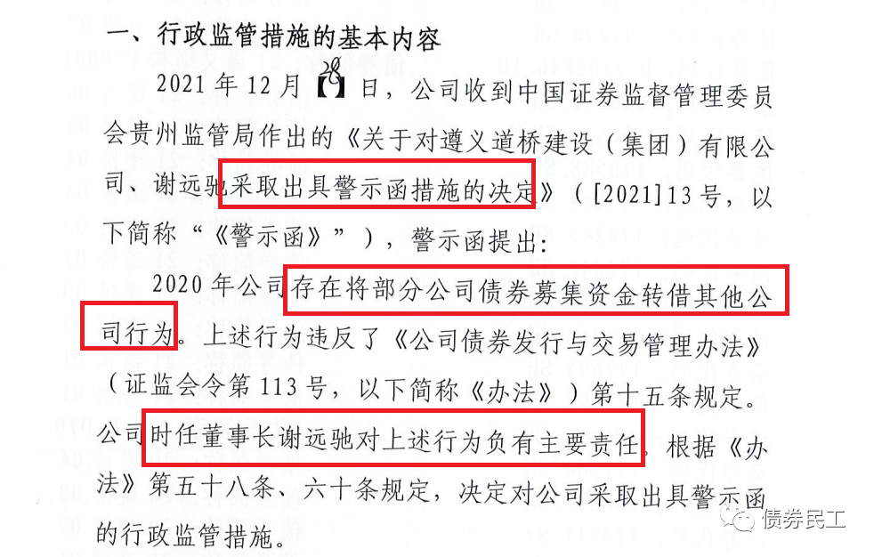 1、根據遵義道橋建設(集團)有限公司(以下簡稱“遵義道橋”)于2022年1月4日披露的公司公告(公告蓋章日期為2021年12月31日),因為在2020年存在將部分公司債券募集資金轉借其他公司的行為,被貴州證監局采取出具警示函措施。公告中未披露遵義道橋轉借債券募集資金涉及的具體債券名稱情況。