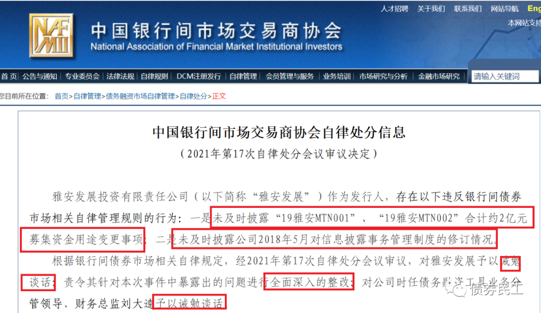 5、根據中國銀行間市市場交易商協會2021年10月29日披露的信息,雅安發展投資有限責任公司因未及時披露“19雅安MTN001”、19雅安MTN002”募集資金用途變更、未及時披露對信息披露事務管理制度的修訂,被交易商協會自律處分。處分措施包括對公司的誡勉談話、全面深入的整改以及對高管的誡勉談話。