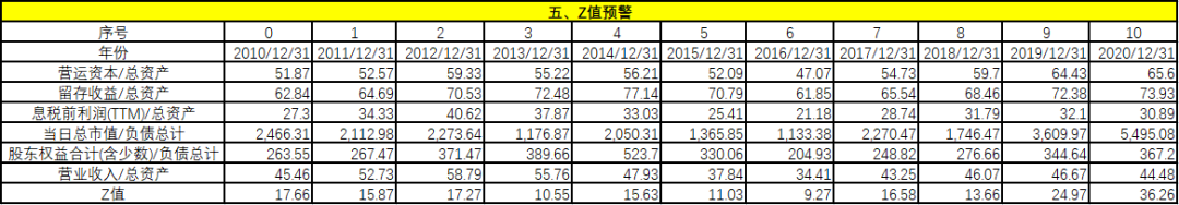 從上面的Z值可以看出,該企業的Z值非常高,遠遠超過了2.675,財務狀況良好,發生破產的概率非常小。
