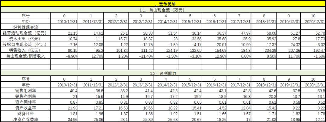從競爭優勢上看,自由現金流/銷售收入在過去11年中有1年為負,剩余10年都遠遠大于5%,經營績效異常穩健。毛利率基本不變,維持在90%以上,說明對上下游都有極強的把控力。在毛利率不變的情況下,凈利率穩步提升。資產周轉率基本保持不變,說明企業雖然在變大,但經營效率持續穩定。資產收益率和凈資產收益率穩步提升,財務杠桿略有下降。從這些指標可以看出,該企業的競爭優勢非常明顯。