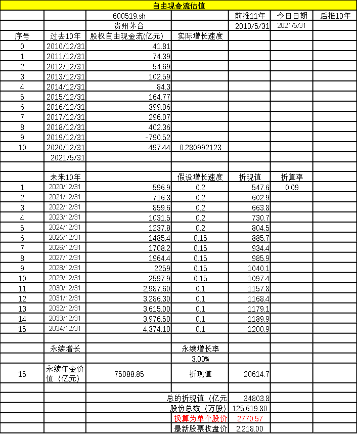 貴州茅臺全部內在價值為3.48萬億元,折合單個股票價格為2770.57元,截止到2021年5月31日,貴州茅臺的收盤價為2218元,遠遠低于其內在價值。