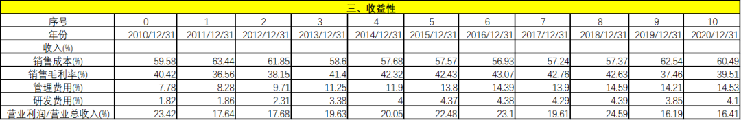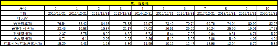 從收益性上看,管理費率提升后有所壓縮,說明企業意識到非生產條線的薪酬增長過快,影響了利潤,因此有所壓降。研發費用處于穩定狀態。但,營業利潤/營業總收入近期下降得比較多。