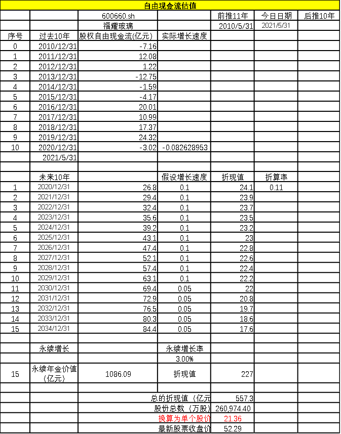 雖然福耀玻璃名氣非常大,但自由現金流估值模型給出的總估值為557.33億元,換算成個股,股價為21.36元,低于2021年5月31日52.29元的收盤價。