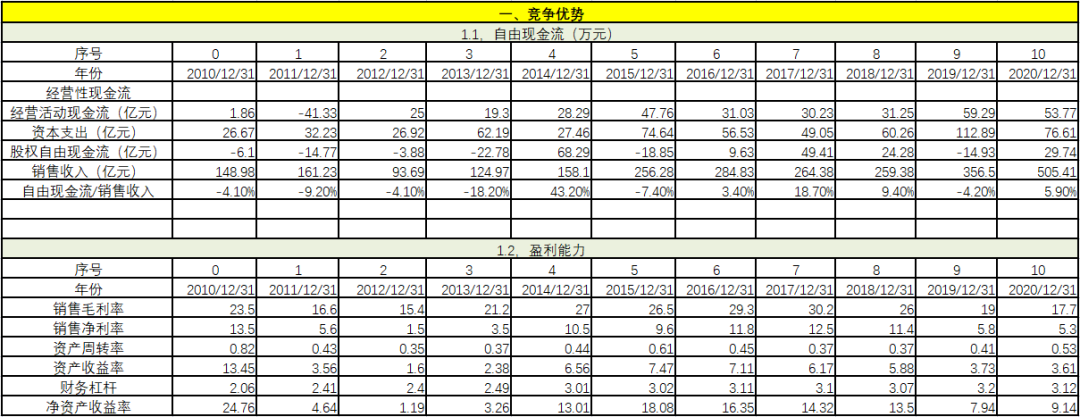 從競爭優勢上看,自由現金流/銷售收入在過去11年中有6年為負,并且僅有4年大于5%,經營績效并不穩健。相對于經營活動現金流,資本開支過大,也就是說,企業自己的造血功能不足以支撐企業的長遠發展,有一定的危險性。