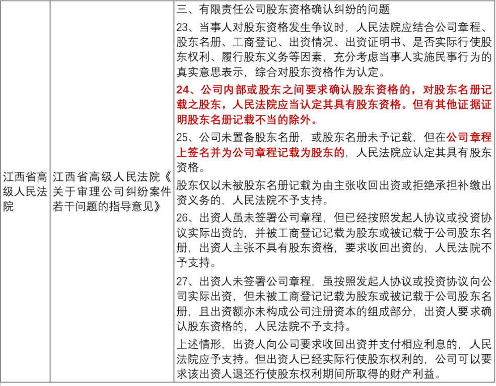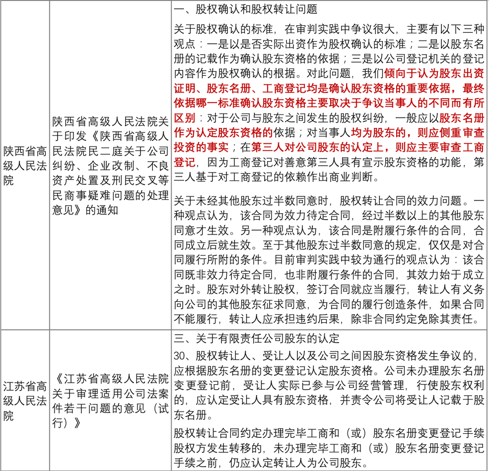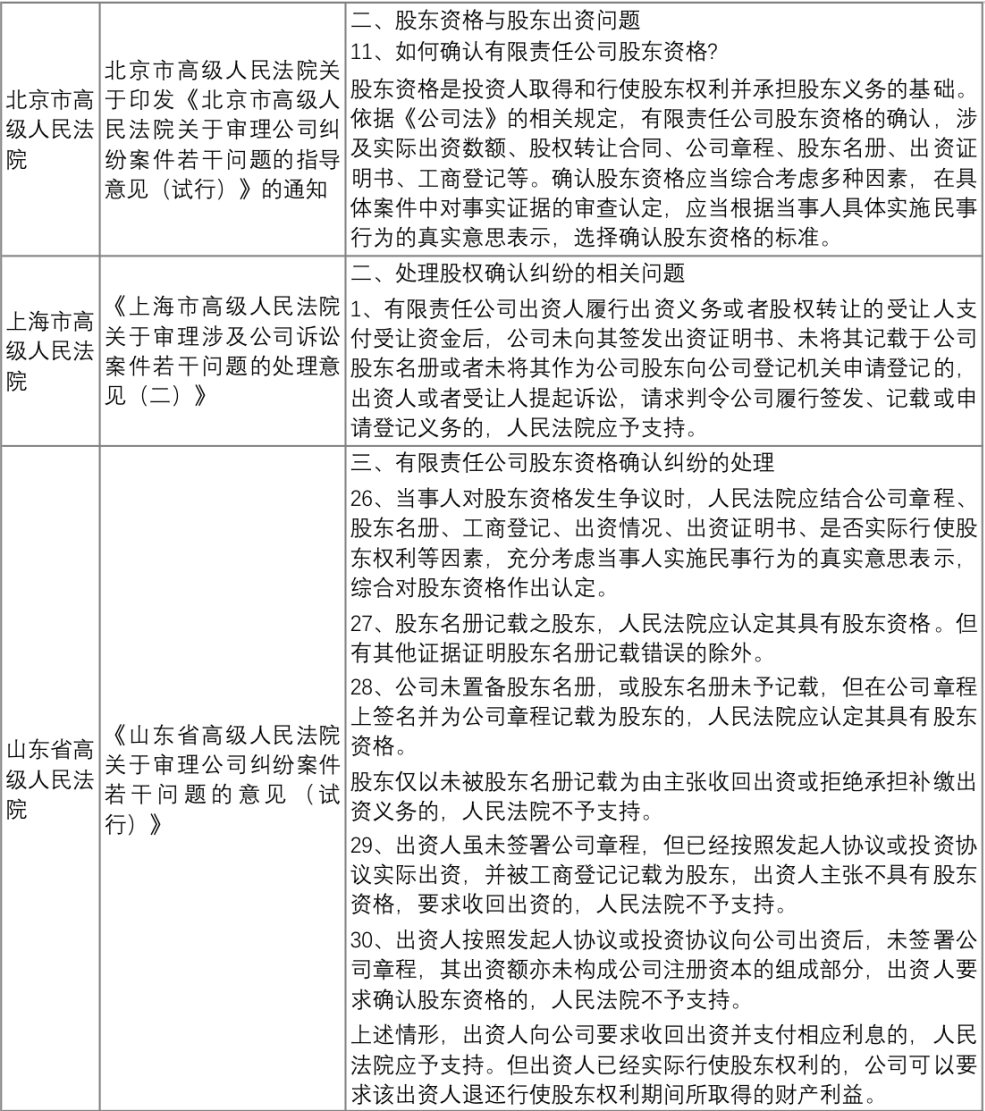 附錄:部分省市高院關(guān)于股東資格確認(rèn)的相關(guān)意見