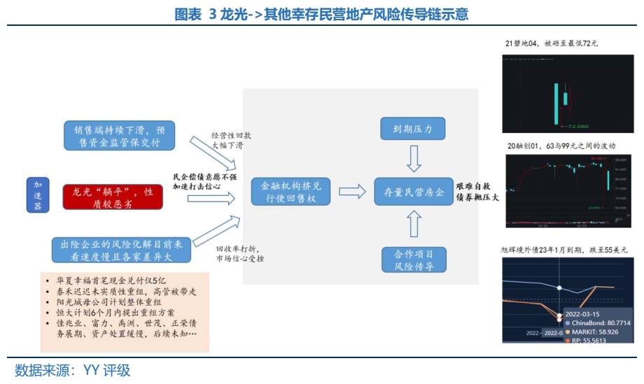 龍光憑一己之力帶崩其他幸存小伙伴,償債意愿難被證實或證偽,金融機構到期不續或審批完成后觀望不放款進一步擠壓剩余民營房企生存空間,負循環難停,信用債生態體系被破壞。