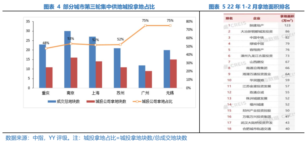 在較強的流動性壓力約束下,多數民營房企自21年下半年來就鮮少拿地,其市場份額被其他國企央企開發商以及區域城投所占據,廣州、無錫等城市第三輪集中供地中城投拿地占比達到了75%。22年1-2月的拿地建面看,城投參與拿地的積極性仍在延續,其背后體現的依舊是政府救市的意志,在地產下行周期里為降低流拍率,穩定土地價格的“托底”行為,也與城投謀求市場化轉型相契合。