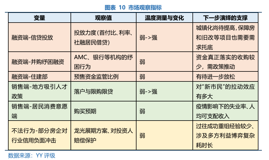 可以從市場和主體兩個維度進行觀察:一方面,結合銷售起色和融資配套感知溫度變化,另一方面,觀察出險企業紓困進展、對流動性緊張民企的外力救助以及對不法事件的問責,衡量對市場的潛在沖擊。