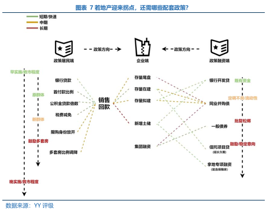 通過我們的分析,政策將會繼續在“房住不炒”定調下,從對市場有利的角度出發,針對房企的銷售端、融資端出臺相關政策。基于政策推動下政策的傳導路徑,地產融資根本性改善最終還是取決于銷售的實質性扭轉。