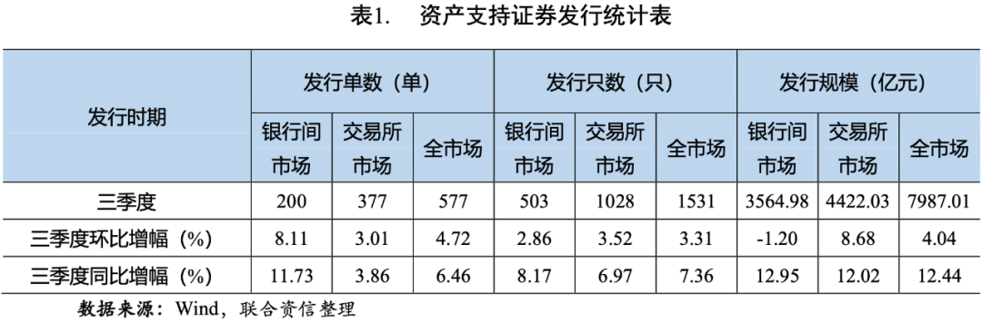 分市場(chǎng)看,2021年三季度,銀行間市場(chǎng)共發(fā)行200單503只資產(chǎn)支持證券,發(fā)行規(guī)模為3564.98億元,發(fā)行單數(shù)和只數(shù)環(huán)比、同比均有所增長(zhǎng),發(fā)行規(guī)模環(huán)比略有下降,同比有所增長(zhǎng);交易所市場(chǎng)共發(fā)行377單1028只資產(chǎn)支持證券,發(fā)行規(guī)模為4422.03億元,發(fā)行單數(shù)、只數(shù)和規(guī)模環(huán)比、同比均有所增長(zhǎng)(見表1)。總體看,交易所市場(chǎng)資產(chǎn)支持證券的發(fā)行規(guī)模環(huán)比增幅高于銀行間市場(chǎng),主要是交易所市場(chǎng)消費(fèi)性貸款、小額貸款和商業(yè)房地產(chǎn)抵押貸款等資產(chǎn)支持證券發(fā)行量上升所致。