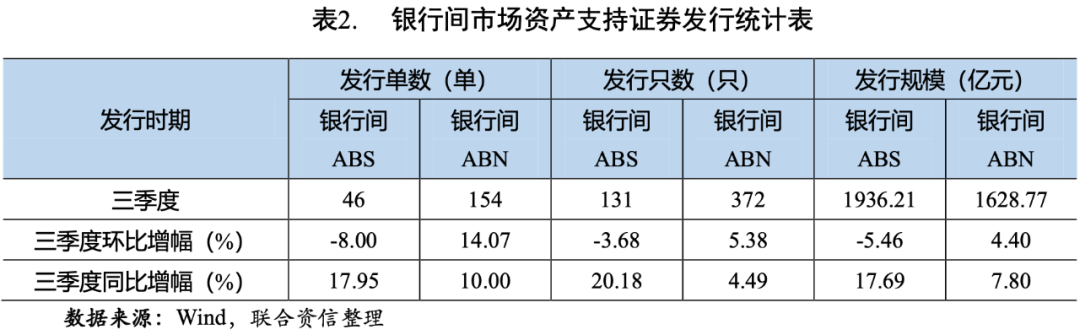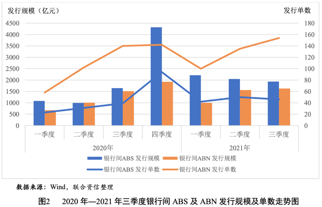 從銀行間市場(chǎng)來(lái)看,2021年三季度,信貸資產(chǎn)支持證券(以下簡(jiǎn)稱“銀行間ABS”)共發(fā)行46單131只,發(fā)行規(guī)模為1936.21億元,發(fā)行單數(shù)、只數(shù)和發(fā)行規(guī)模環(huán)比均有所下降,與上年同期相比,發(fā)行單數(shù)、只數(shù)、發(fā)行規(guī)模均大幅上升;銀行間資產(chǎn)支持票據(jù)(以下簡(jiǎn)稱“銀行間ABN”)共發(fā)行154單372只,發(fā)行規(guī)模為1628.77億元,發(fā)行單數(shù)、只數(shù)和規(guī)模環(huán)比、同比均有所增長(zhǎng)(見表2和圖2)。總體看,三季度銀行間ABS發(fā)行單數(shù)、只數(shù)和規(guī)模同比增幅較銀行間ABN更高,主要源于基礎(chǔ)資產(chǎn)為小額貸款的資產(chǎn)支持證券發(fā)行同比增幅較大,在引導(dǎo)金融機(jī)構(gòu)加大對(duì)小微企業(yè)支持力度的政策背景下,發(fā)行小微企業(yè)貸款A(yù)BS是銀行用來(lái)盤活存量小微貸款、打通小微企業(yè)融資渠道、助力普惠金融發(fā)展的一項(xiàng)重要舉措。