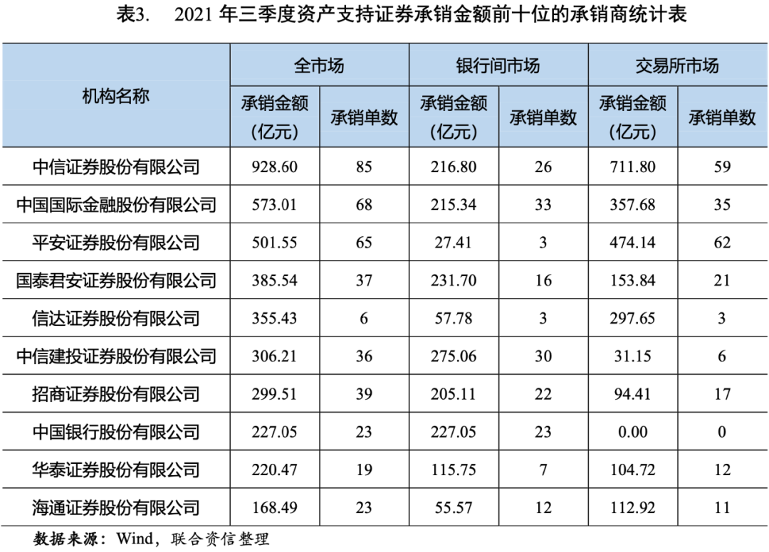 從資產(chǎn)支持證券的承銷情況來(lái)看,2021年三季度,中信證券股份有限公司、中國(guó)國(guó)際金融股份有限公司和平安證券股份有限公司的承銷金額、承銷單數(shù)均位居前三位(見表3)。