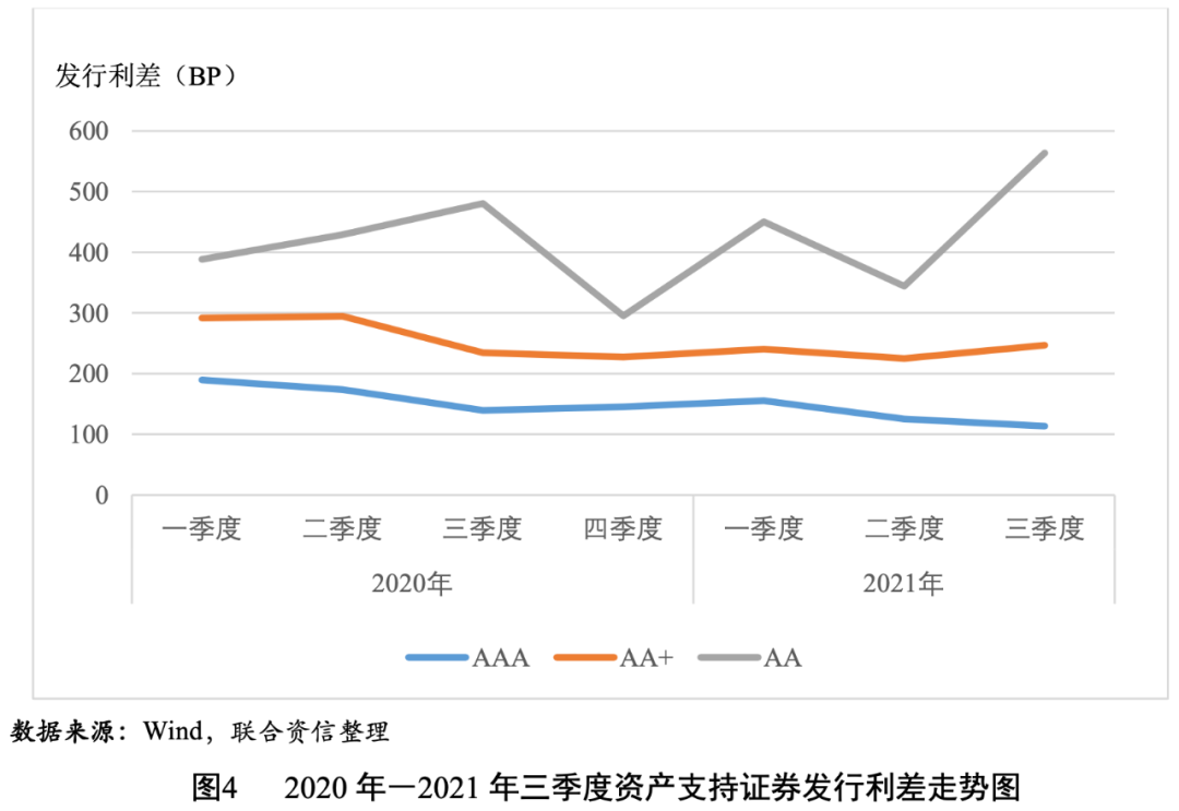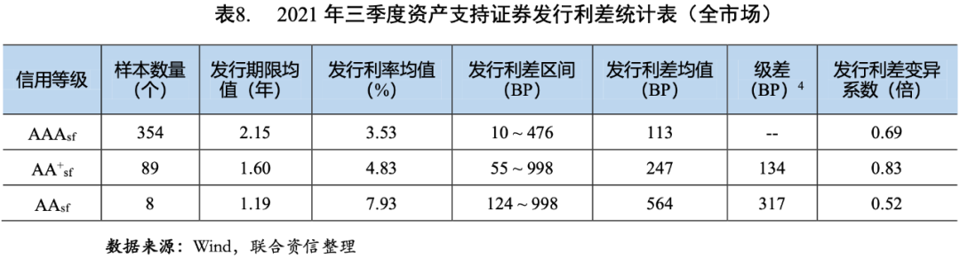 2021年三季度,資產(chǎn)支持證券的發(fā)行利率和利差均值均隨信用等級(jí)的下降而上升(見圖3和圖4),說(shuō)明信用評(píng)級(jí)對(duì)資產(chǎn)支持證券的信用風(fēng)險(xiǎn)具有較好的區(qū)分度。AAAsf、AA+sf和AAsf級(jí)資產(chǎn)支持證券的發(fā)行利差均值分別為113BP、247BP和564BP,AAAsf級(jí)資產(chǎn)支持證券的發(fā)行利差均值環(huán)比下降12BP,同比下降26BP;AA+sf和AAsf級(jí)資產(chǎn)支持證券的發(fā)行利差均值環(huán)比分別上升22BP和220BP,同比分別上升13BP和84BP。AAAsf級(jí)和AA+sf級(jí)之間的級(jí)差為134BP,同比、環(huán)比均有所上升,反映了在經(jīng)濟(jì)恢復(fù)趨緩背景下,市場(chǎng)不確定性上升,投資者對(duì)低級(jí)別資產(chǎn)支持證券要求的風(fēng)險(xiǎn)溢價(jià)進(jìn)一步提高;AA+sf級(jí)和AAsf級(jí)之間的級(jí)差為317BP,可能與AAsf級(jí)資產(chǎn)支持證券樣本數(shù)目過(guò)少而缺乏代表性有關(guān)。AA+sf級(jí)資產(chǎn)支持證券的發(fā)行利差的變異系數(shù)相對(duì)較高,說(shuō)明投資者對(duì)AA+sf級(jí)資產(chǎn)支持證券的信用風(fēng)險(xiǎn)判斷存在分化。