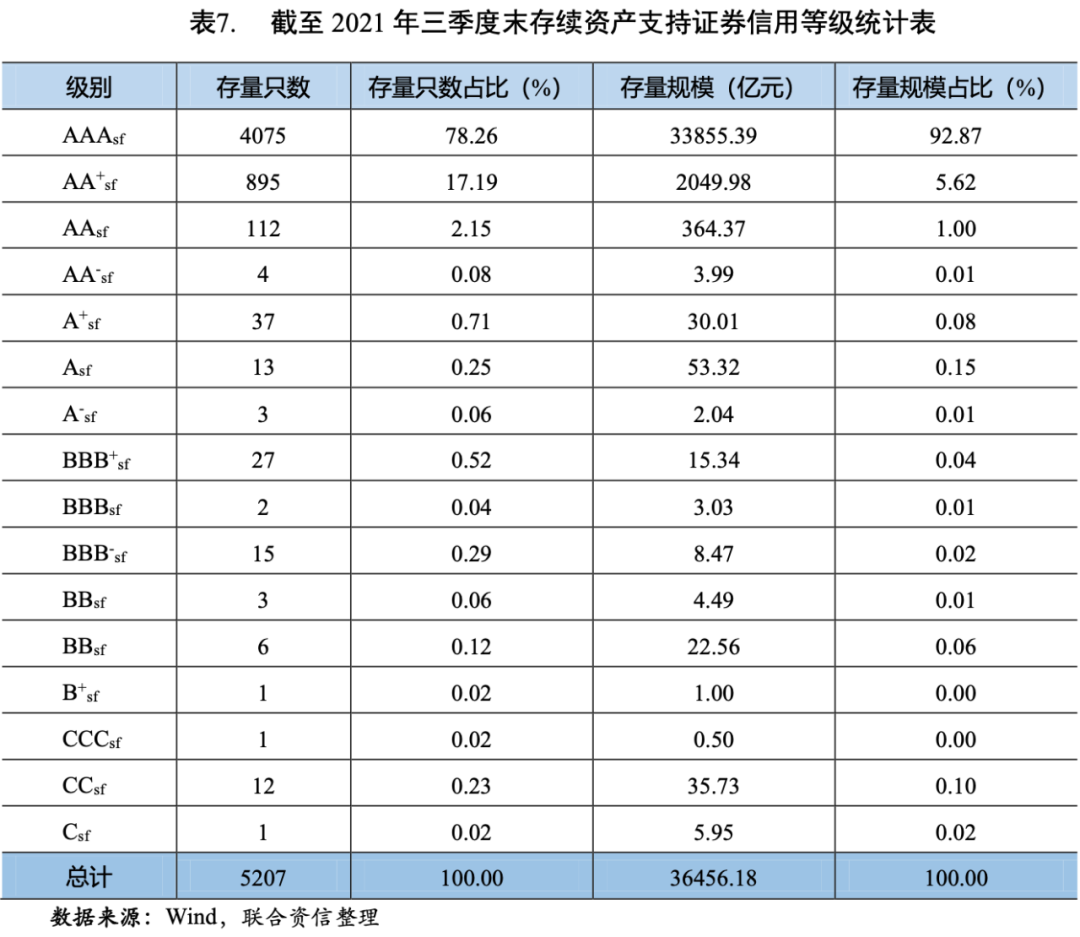 2021年三季度,新發(fā)行的資產(chǎn)支持證券中,有824只具有信用評(píng)級(jí),總體上集中于AAAsf和AA+sf,AAAsf級(jí)資產(chǎn)支持證券的發(fā)行只數(shù)占比81.80%,發(fā)行規(guī)模占比96.00%;AA+sf級(jí)資產(chǎn)支持證券的發(fā)行只數(shù)占比約14.44%,發(fā)行規(guī)模占比約3.55%(見表6)。