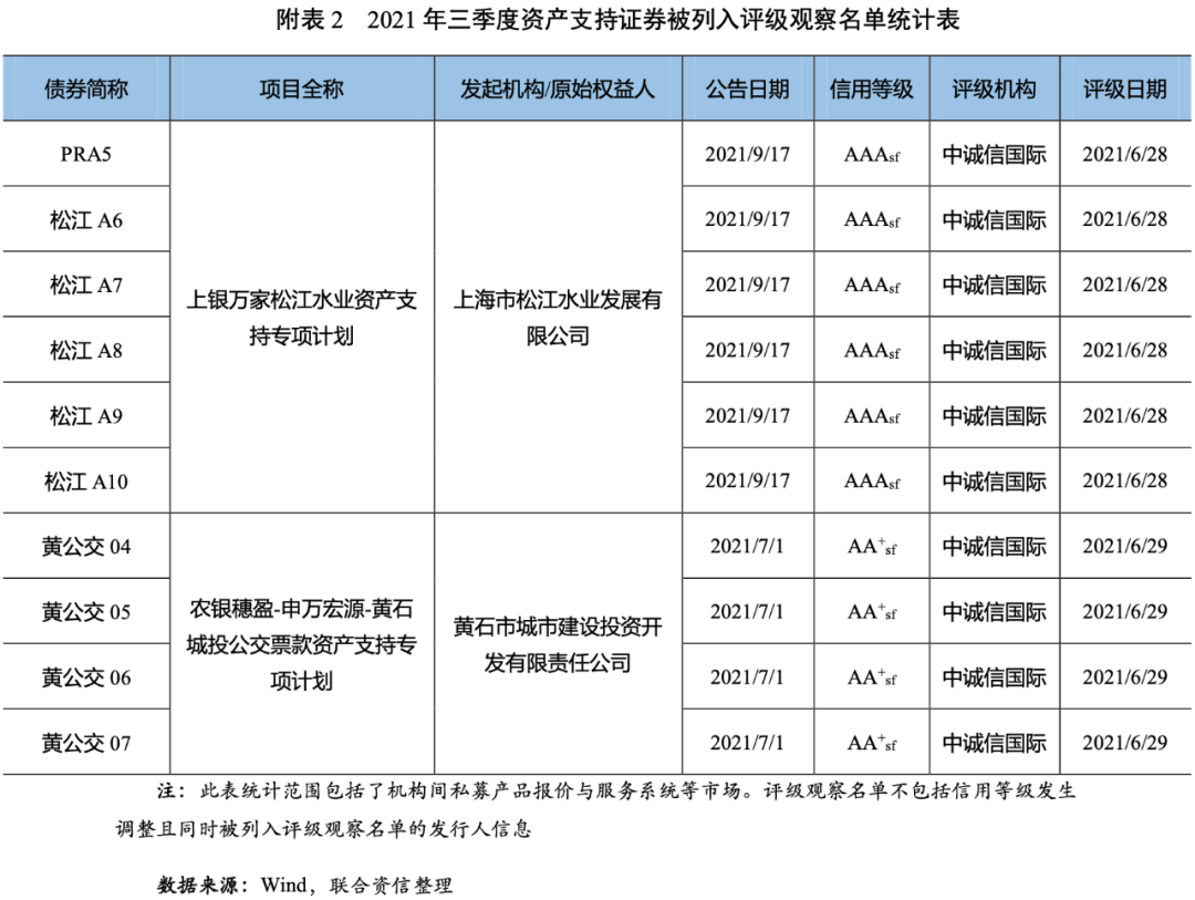 2021年三季度,債券市場(chǎng)上未出現(xiàn)資產(chǎn)支持證券違約;14只資產(chǎn)支持證券信用評(píng)級(jí)下調(diào)(見附表1),同比大幅增加7只;10只資產(chǎn)支持證券被列入評(píng)級(jí)觀察名單[2](見附表2),同比減少4只。