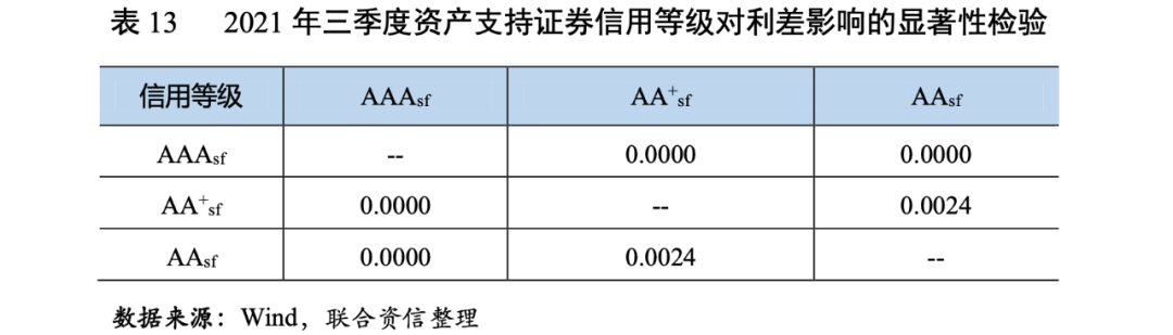 為了檢驗(yàn)信用等級(jí)對(duì)資產(chǎn)支持證券發(fā)行利差影響的顯著性,我們采用了Mann-Whitney U 兩獨(dú)立樣本非參數(shù)檢驗(yàn)方法,對(duì)AAAsf、AA+sf和AAsf級(jí)兩兩之間的利差分布進(jìn)行顯著性檢驗(yàn)。2021年三季度,在95%的置信水平下,AAAsf級(jí)和AA+sf級(jí)、AAAsf級(jí)和AAsf級(jí)之間、AA+sf級(jí)和AAsf級(jí)之間均通過(guò)檢驗(yàn),具有顯著性差異。整體來(lái)看,信用等級(jí)對(duì)發(fā)行利差具有區(qū)分性,評(píng)級(jí)結(jié)果得到了投資者認(rèn)可(表13)。