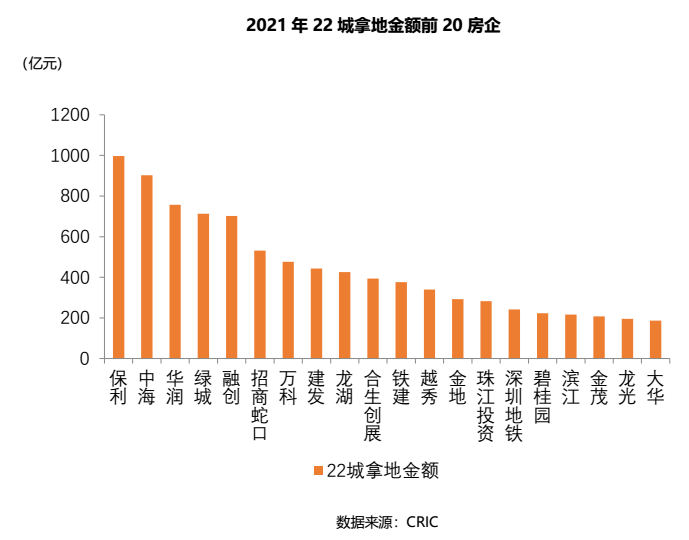 從22城拿地金額情況看,保利、中海、華潤拿地金額排名前三位,三家均為央企。拿地最多的10家房企中,7家為國企央企,3家為民企;拿地最多的20家房企中,11家是國企央企,9家是民企,國企央企占據較大優勢。