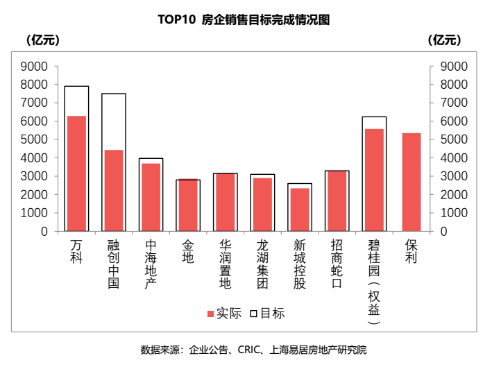 TOP10房企中,除保利未公布2021年銷售目標外,僅華潤、金地完成了2021年年度的銷售目標;中海、龍湖、招商蛇口完成率達到九成以上;新城、碧桂園完成率接近九成;萬科、融創完成率較低。