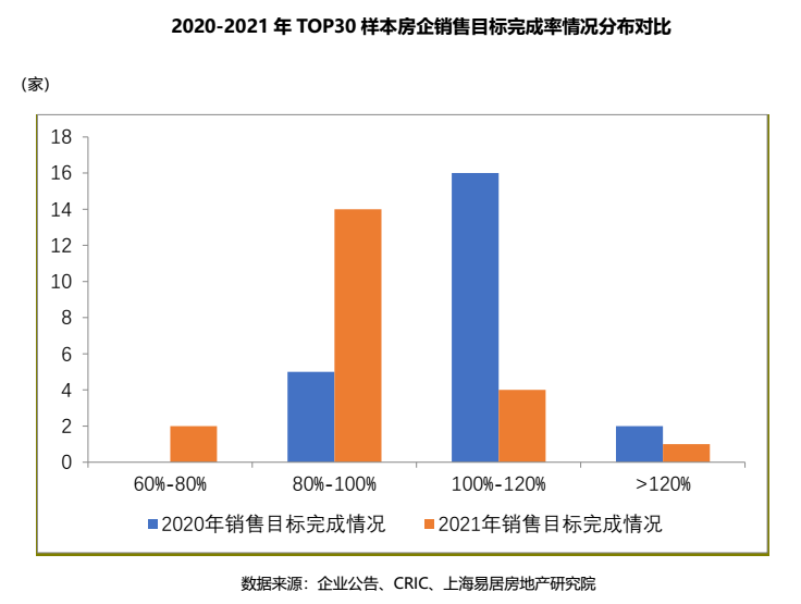 再放到TOP30樣本房企,目標完成率平均值為96%,較上年下降13個百分點;約8成的房企銷售未達標,僅5家房企完成了銷售任務。