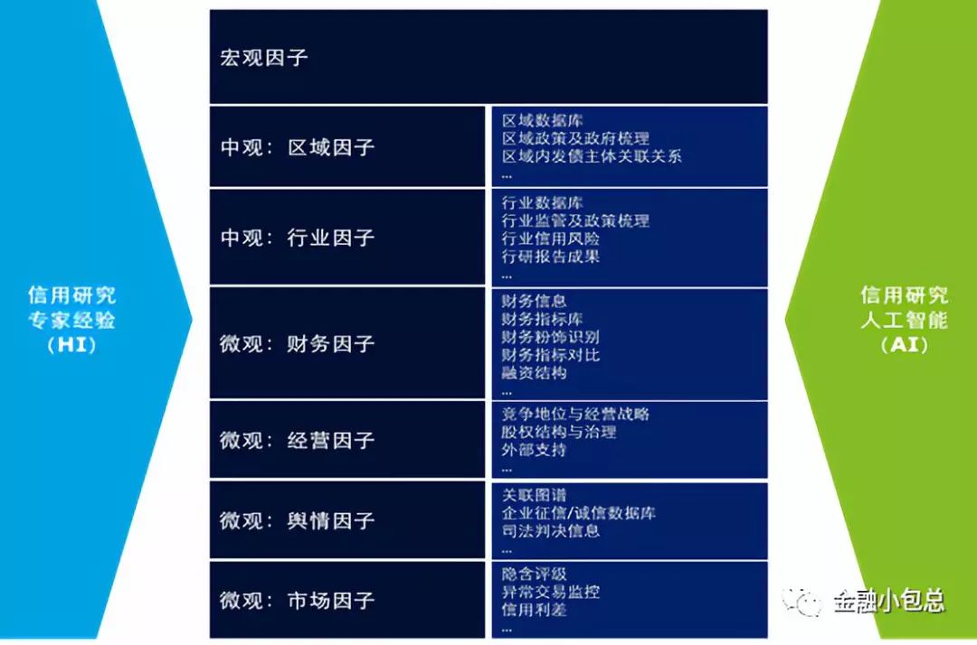 內(nèi)評(píng)體系化建設(shè)的核心落腳點(diǎn)在于提升團(tuán)隊(duì)的風(fēng)險(xiǎn)識(shí)別、風(fēng)險(xiǎn)計(jì)量、風(fēng)險(xiǎn)緩釋及處置能力。風(fēng)險(xiǎn)識(shí)別是信用風(fēng)險(xiǎn)評(píng)估入口的問題,風(fēng)險(xiǎn)計(jì)量是信用風(fēng)險(xiǎn)評(píng)估出口的問題。信用風(fēng)險(xiǎn)的評(píng)估環(huán)節(jié)入口應(yīng)綜合專家經(jīng)驗(yàn)和人工智能兩套方法論,而信用評(píng)估的出口環(huán)節(jié)精細(xì)化信用研究成果如下圖所示: