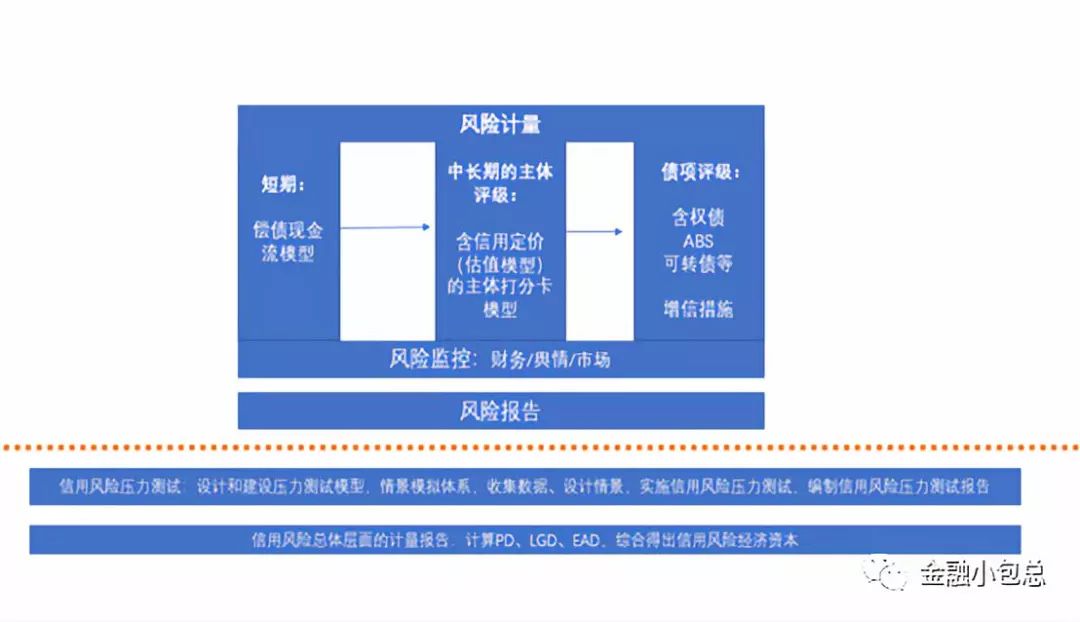 管理機(jī)制通過(guò)十個(gè)模塊的合力,達(dá)到監(jiān)管要求的可監(jiān)測(cè)、能計(jì)量、能分析、可應(yīng)對(duì)。而其中核心的是通過(guò)內(nèi)評(píng)體系提升前臺(tái)信評(píng)的風(fēng)險(xiǎn)識(shí)別和風(fēng)險(xiǎn)計(jì)量能力、輔助中臺(tái)信用風(fēng)險(xiǎn)管控工作。