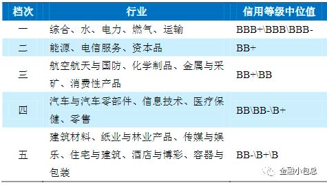 宏觀和行業(yè)維度看,大致可以分為三塊工作。第一是充分借鑒賣方行業(yè)研究的成果。第二是針對(duì)行業(yè)信用風(fēng)險(xiǎn),梳理各行業(yè)信用研究的邏輯框架,抓住行業(yè)信用的顯著特性,監(jiān)控每年度行業(yè)信用風(fēng)險(xiǎn)的變化,并根據(jù)行業(yè)景氣度確定行業(yè)中長(zhǎng)期級(jí)別中樞??蓞⒖寄碌稀?biāo)普、惠譽(yù)給予不同行業(yè)敞口不同信用評(píng)級(jí)中樞的做法,如下圖: