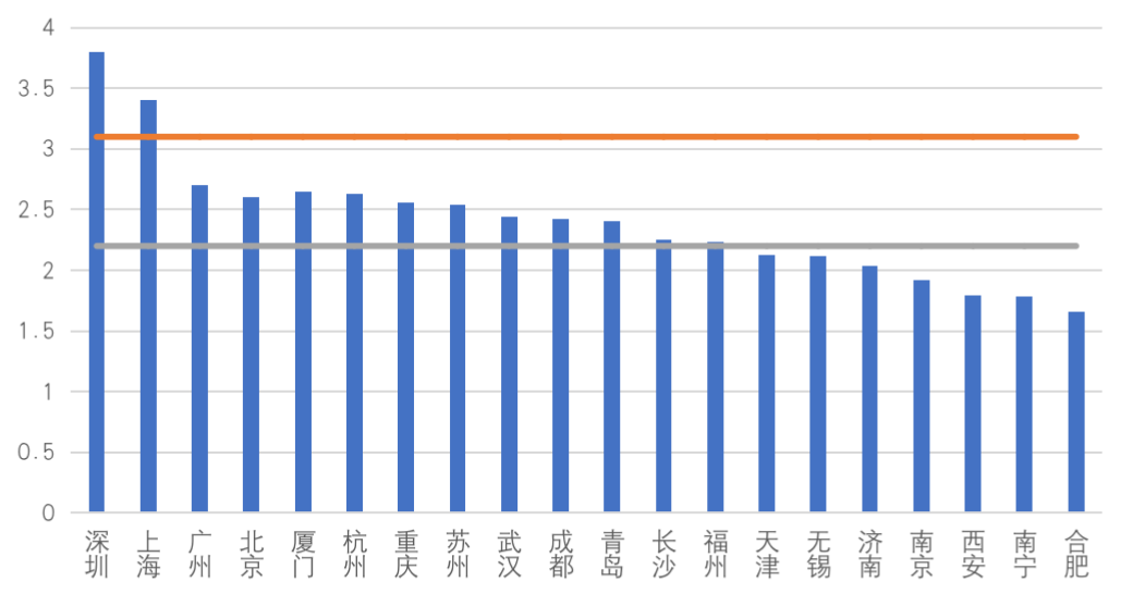 據(jù)CPIC克而瑞物管數(shù)據(jù)顯示,全國重點20城平均物業(yè)費為2.4元/㎡/月,在這其中,深圳最高為3.8元/平米/月,其次是上海,為3.4元/平米/月,深圳和上海是重點20城中僅有2個物業(yè)費超過3元/平米/月,受其影響,一線城市住宅平均物業(yè)費為3.1元/㎡/月。