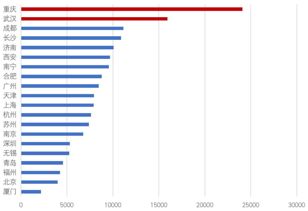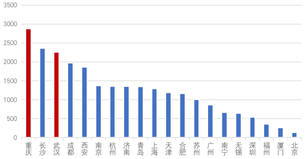 從近一年住宅用地成交規(guī)模來看,重慶、長沙、武漢、成都等中西部城市表現(xiàn)依然強勁,重慶成交規(guī)模2877萬平方米居首位。隨著項目的建設(shè)交付,我們相信,這些項目將在未來一年轉(zhuǎn)化為該城市企業(yè)的重點拓展對象。