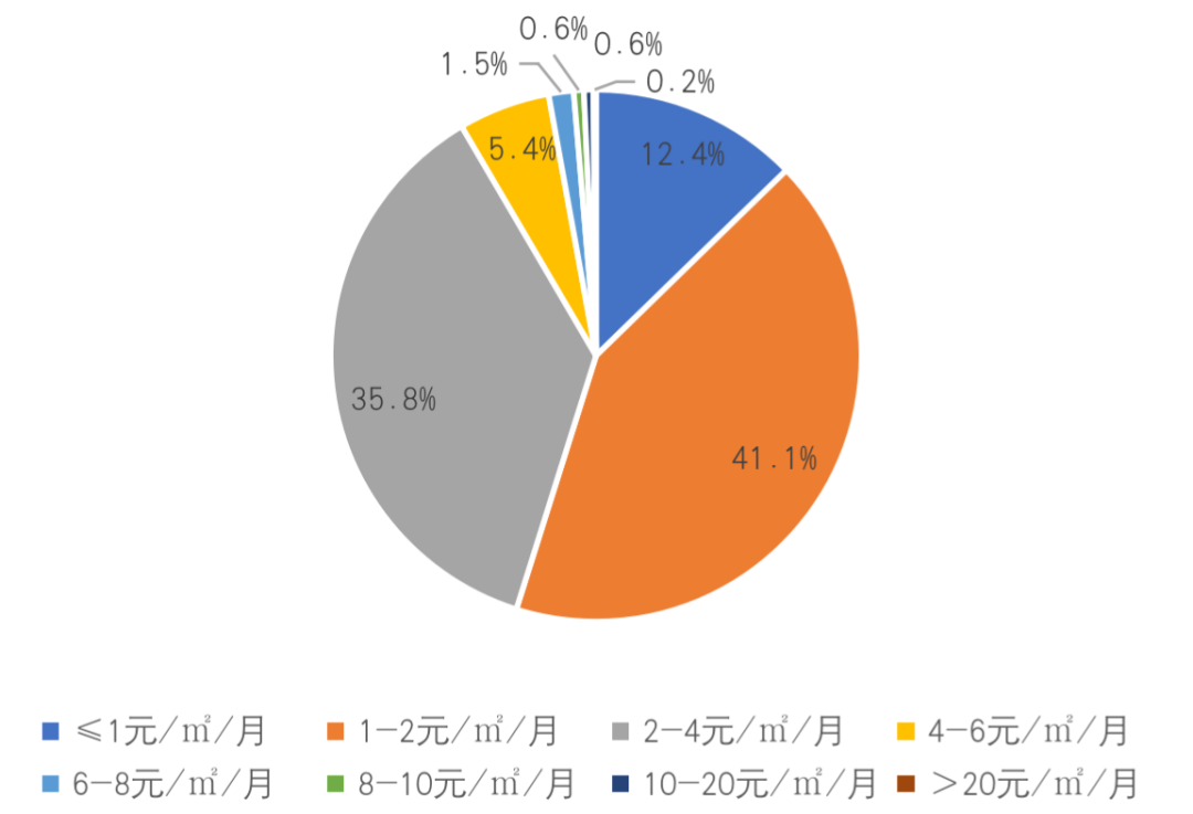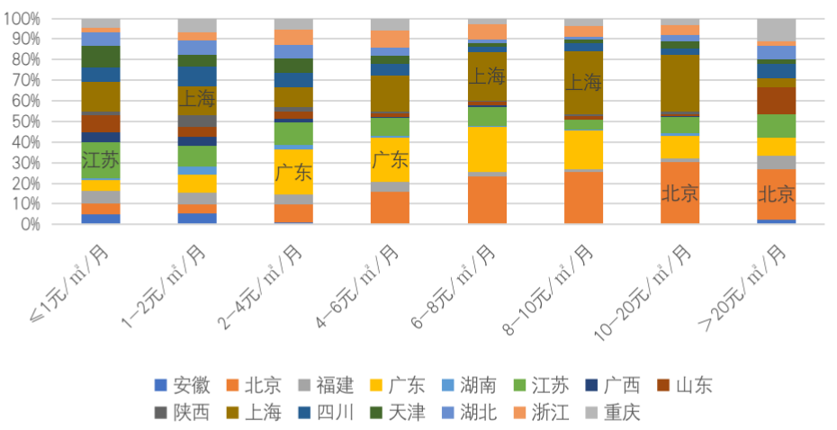 其中10-20元/㎡/月價格段中北京、上海兩市合計占比近60%,一線城市高物業(yè)費壟斷明顯。